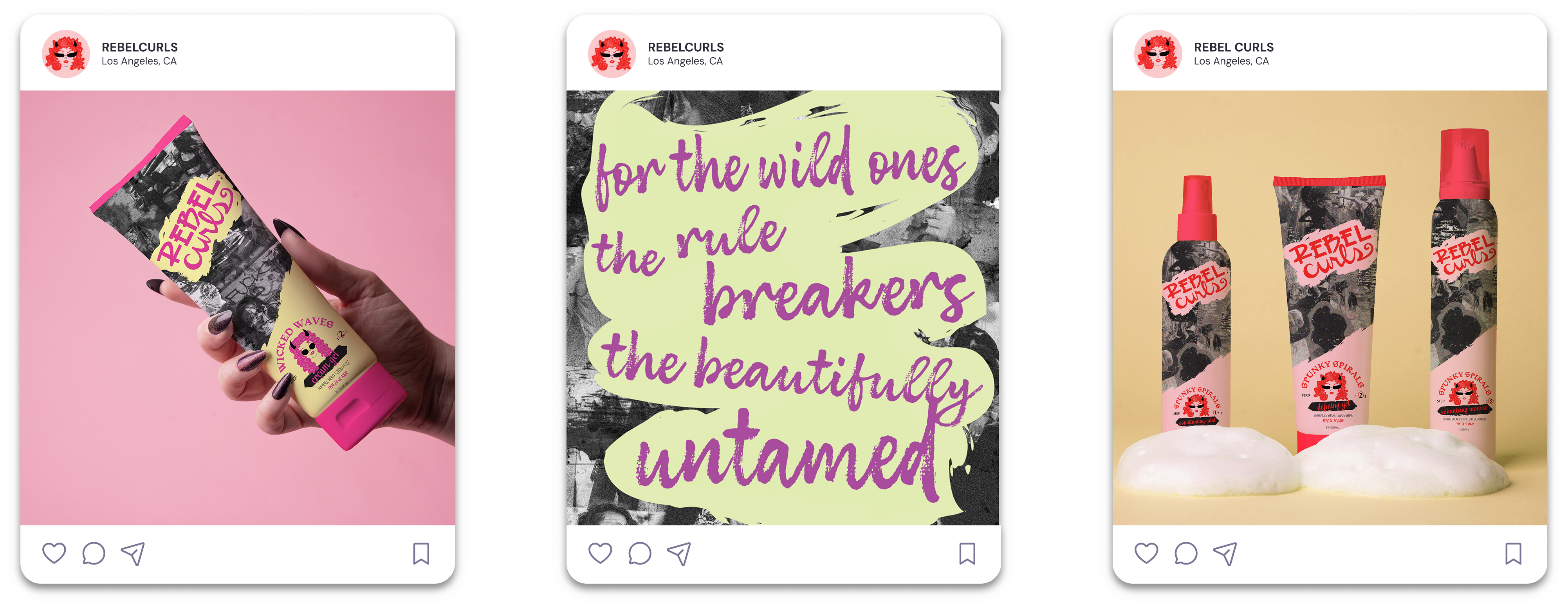 I created a brand that offers curly haircare products called Rebel Curls. I hand lettered the logo with the intention of capturing the playful and unpredictable nature of having curly hair. Within the brand I invented 3 different lines of products for wavy, curly and coily hair. For the packaging, I created three distinct collages to capture the rebellious and playful nature of the brand. I also created three individual characters to represent each of the three lines of hair products based on curl types.